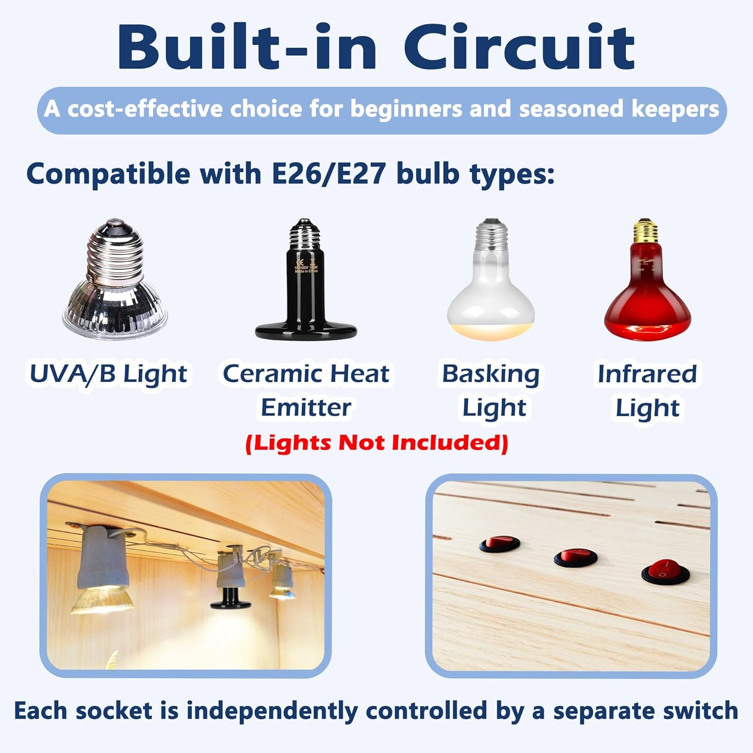 - 【Built-in Bulb Sockets】Featuring two built-in bulb sockets (three in the 40&48-inch version) compatible with E27 heat bulbs, night lights, and more (bulbs not included). Easily set up your lighting for the perfect reptile habitat.