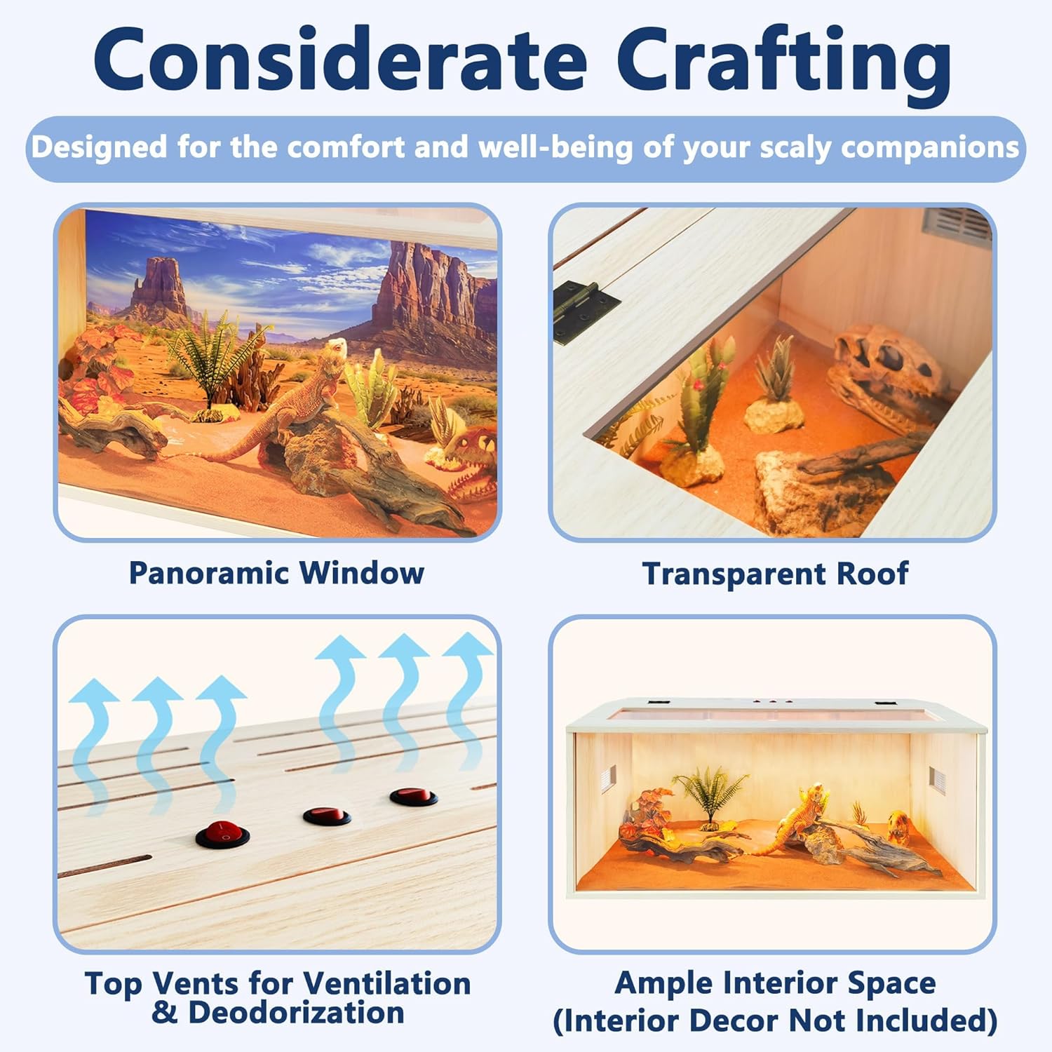 - 【Premium Reptile Habitat】Designed for reptile enthusiasts, our enclosure offers a spacious interior for your reptiles to roam freely. The transparent front and top acrylic panels provide an unobstructed view, while top vents ensure proper air circulation. Please note: This tank is not suitable for holding water and is available in 4 size variants!