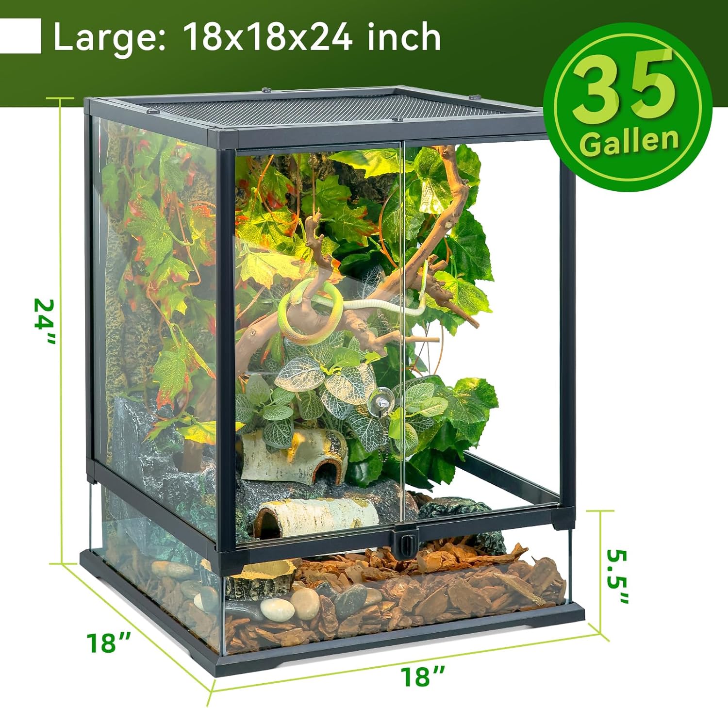 24x18x18'' Glass Reptile Tank Front Opening Terrarium Suitable for Leopard Geckos, Snakes, Tree Frogs, Chameleons,Watertight Base, Ventilated Metal Mesh Top, Pre-Drilled Cable Holes