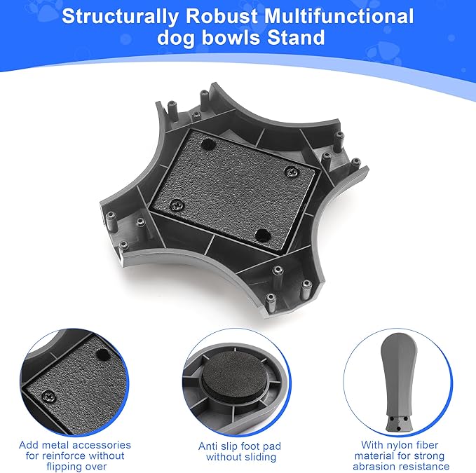 - 【Anti Slip Reinforce Design】The dog bowl stand features a metal base,EVA material foot pad and nylon-fiber reinforced bracket for anti slip reinforcement design.It increases the stability of the bracket and prevents the bowl from tipping over,which is especially important for pets who tend to get excited while eating.Additionally,the design can prevent pets from moving food or water in the bowl while eating or drinking to help keep the feeding area clean and tidy.they can provide a worry-free feeding experience for pets and their owners