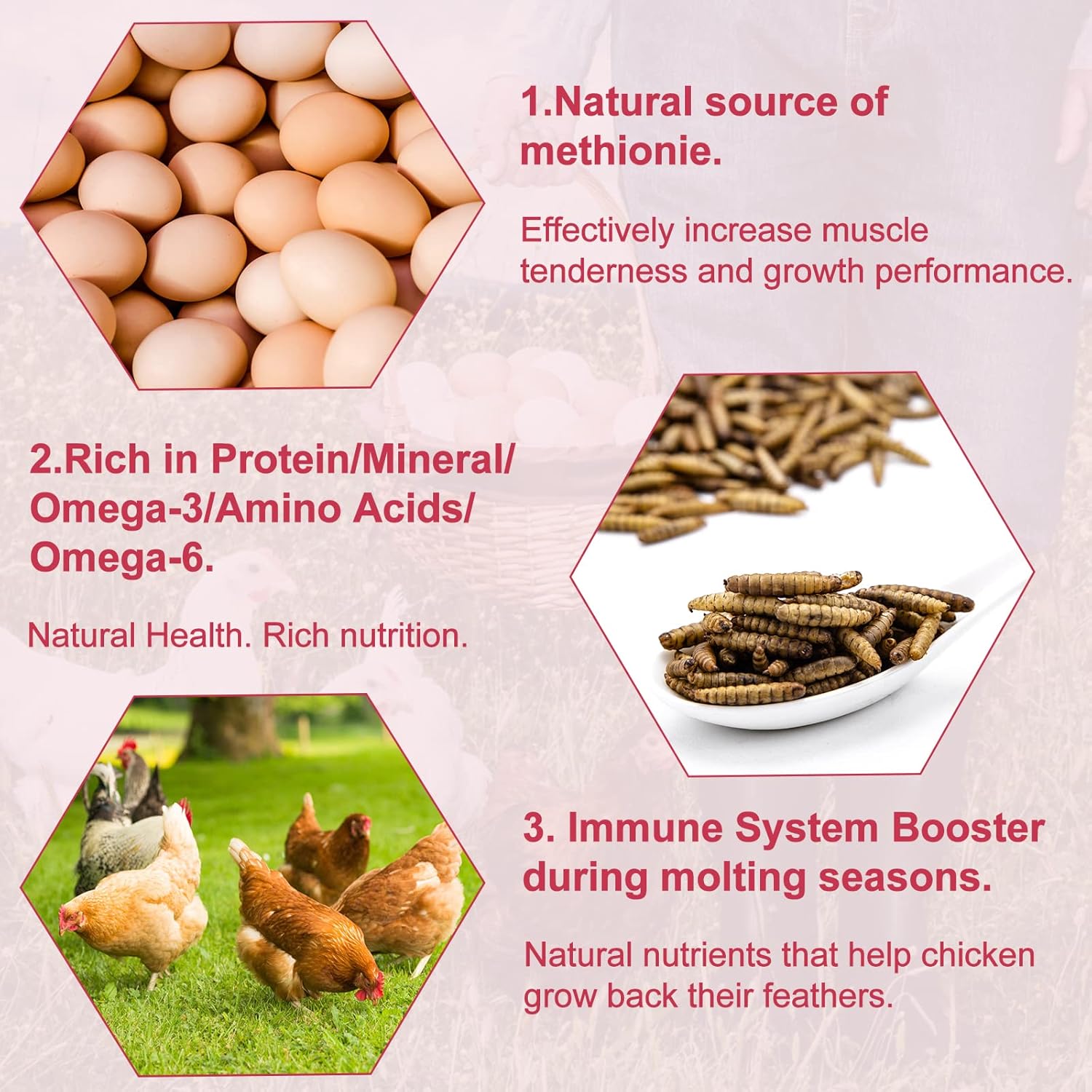 - EXCEPTIONAL PROTEIN CONTENT: With 35% protein dried worms for chicken feed offer 5X the protein compared to traditional chicken feed, support muscle and feather growth, vibrant plumage during molting, support laying hens in producing more quality eggs throughout their laying cycle