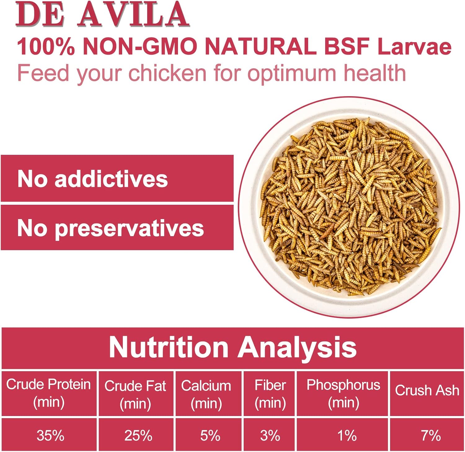 - BLACK FLY LARVAE FOR CHICKENS: DE AVILA black soldier fly larvae for chickens are carefully reared using natural ingredients such as corn, radish. ensuring BSF larvae rich in high protein, high calcium. It is an indispensable chicken treats for laying hens