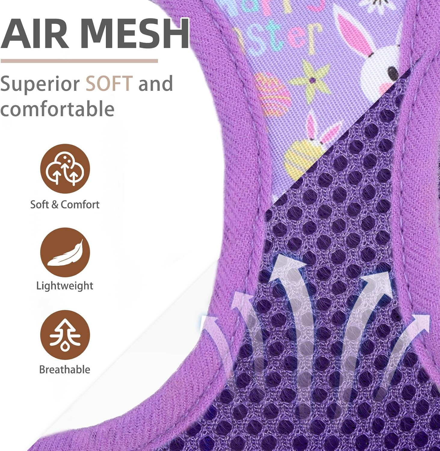 - COMFORTABLE MATERIAL, DAILY WALKING, FOUR SEASONS WEARING: - The harness is made of durable polyester, and it's adopted with an air-mesh design. The whole harness is very soft, lightweight, and breathable. Even if your dog wears it all day, he won't feel any discomfort. For daily walking or running, it is a very easy thing to do. Besides, this is a four seasons harness, it keeps the dog cool on hot days and keeps the dog warm on cold days