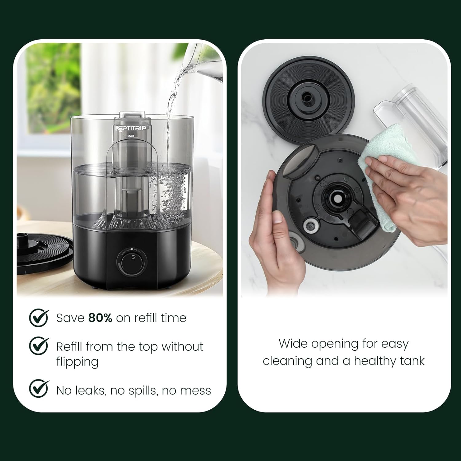 - Leak-Proof Tank: Unlike detachable tanks that easy leak, our reptile humidifier's water tank is built as one solid piece with its base. That means no leaks at all! Comes with rubberized anti-slip base and tip-over protection.