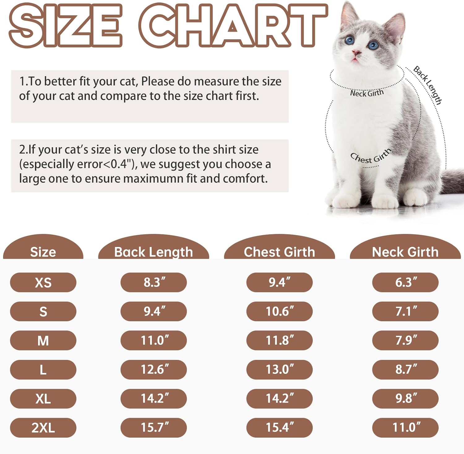 - Size Information- Size XL:Back Length-14.2";Chest Girth-14.2";Neck Girth-9.8";Please check the size chart of the cat full body suit and choose the size suitable for your pet. If you have any questions, please contact us in time, and we will provide you with appropriate solutions
