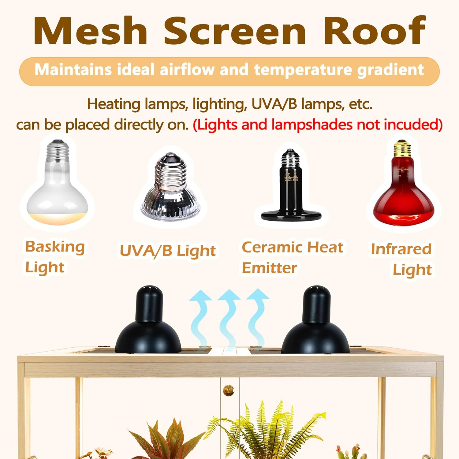 - 【Functional Design】Our terrarium is thoughtfully designed with a user-friendly layout. The double sliding front doors glide effortlessly and feature a secure locking mechanism to ensure your pets remain safe and secure. The top is equipped with durable metal mesh for optimal airflow, ideal for positioning heat lamps and UVA/B lights (not included) to maintain precise environmental conditions.
