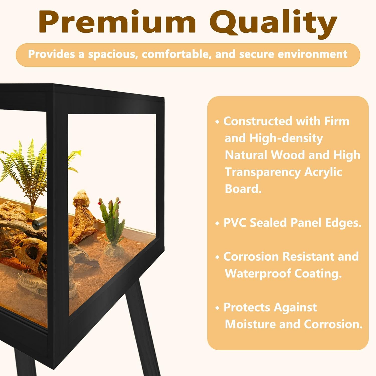- 【Premium Reptile Habitat】For reptile enthusiasts looking for the best living space for their scaly pets, our premium reptile enclosure is an outstanding option. Made from high-quality solid wood coated with waterproof polyester and reinforced with acrylic elements, this habitat ensures a secure and comfortable environment for your scaly companions. Please note, this enclosure is specifically designed for terrestrial reptiles and is not suitable for aquatic use.Note: Items Inside of the cage are NOT included.