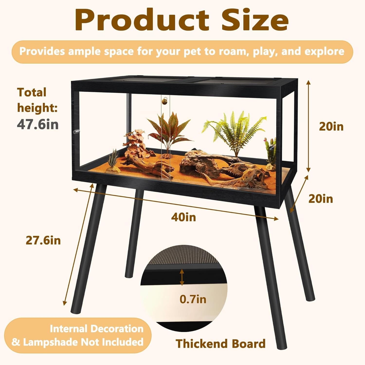 - 【Spacious Interior】Available in 4 sizes ranging from 24 to 48 inches in length, with generous 24-inch legs height, each enclosure offers ample room for your reptiles to explore and thrive. Refer to picture 2 for detailed size information to choose the perfect fit for your pet. The transparent acrylic side panels provide an unobstructed view of your pets' daily activities, while an additional acrylic sheet at the bottom simplifies maintenance and protects against accidental spills.