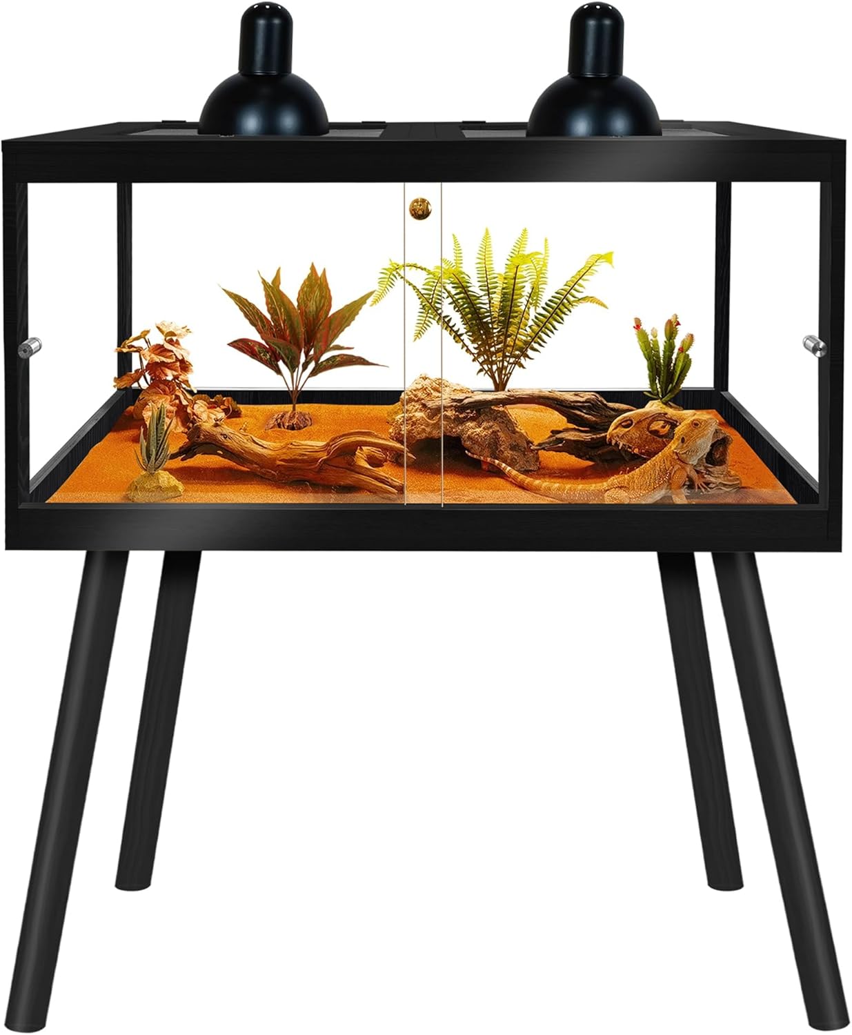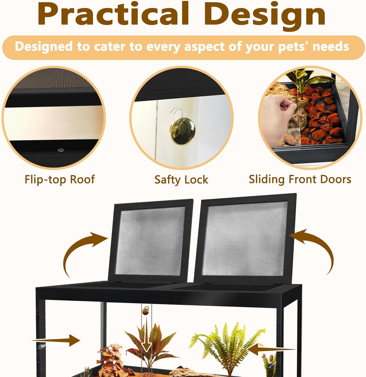 - 【Functional Design】Our terrarium is thoughtfully designed with a user-friendly layout. The double sliding front doors glide effortlessly and feature a secure locking mechanism to ensure your pets remain safe and secure. The top is equipped with durable metal mesh for optimal airflow, ideal for positioning heat lamps and UVA/B lights (not included) to maintain precise environmental conditions.