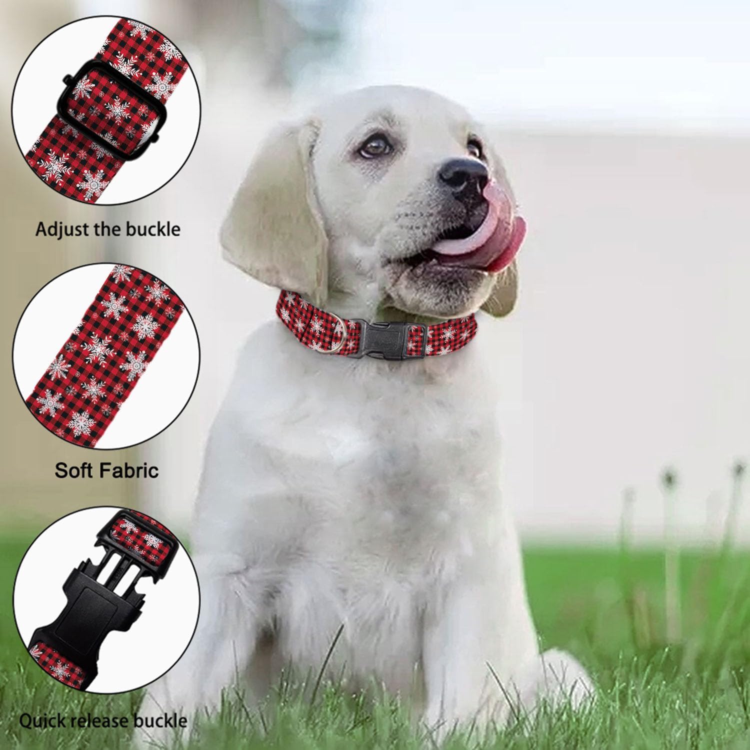 - 2. Material: This Winter Snowflake Christmas Red Black Plaid Gingham dog collars is made of soft, comfortable and elastic polyester fabric, our pet collar strap is designed to be both anti-slip and wear-resistant, ensuring long-lasting use while keeping your furry friend cozy.