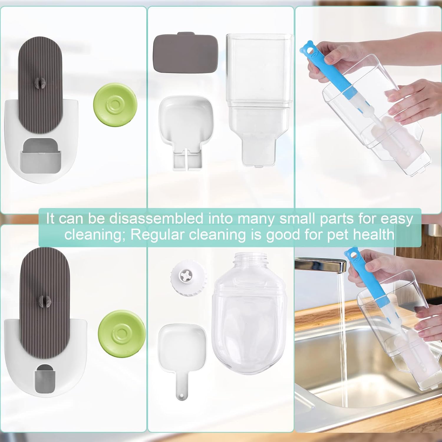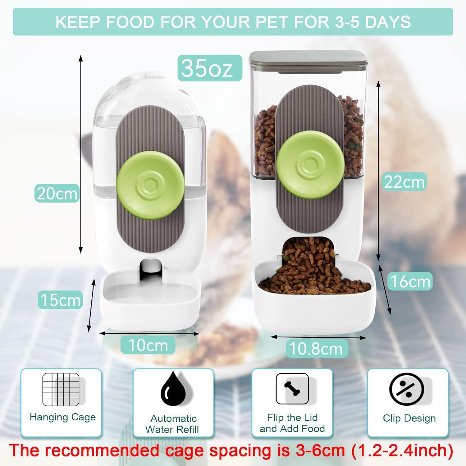 - [Knob Hanging Cage Design] :The hanging cage design of dog food dispenser makes good use of space. It is specially designed for small pets locked in the cage. When adding food and water, it does not need to be disassembled. It can be added outside, which is clean and sanitary