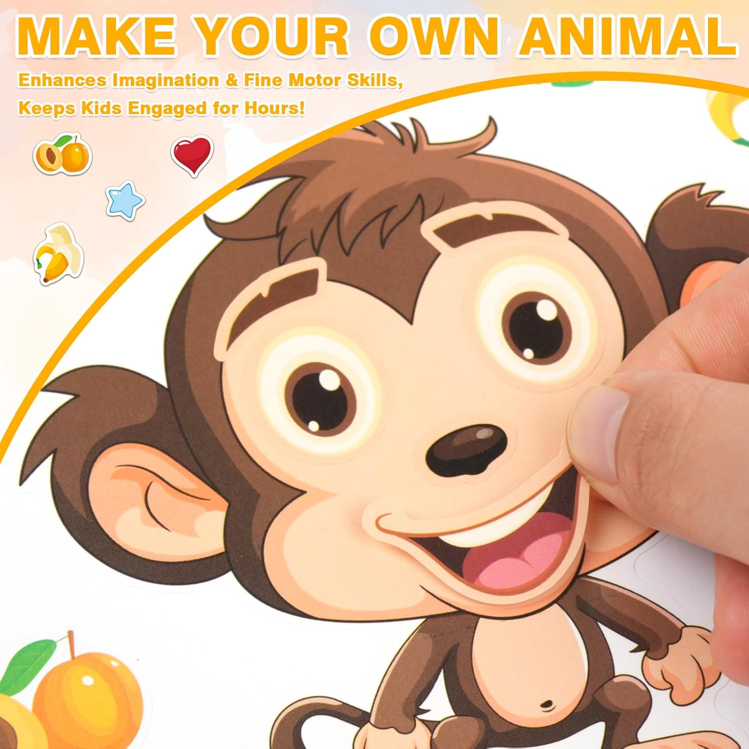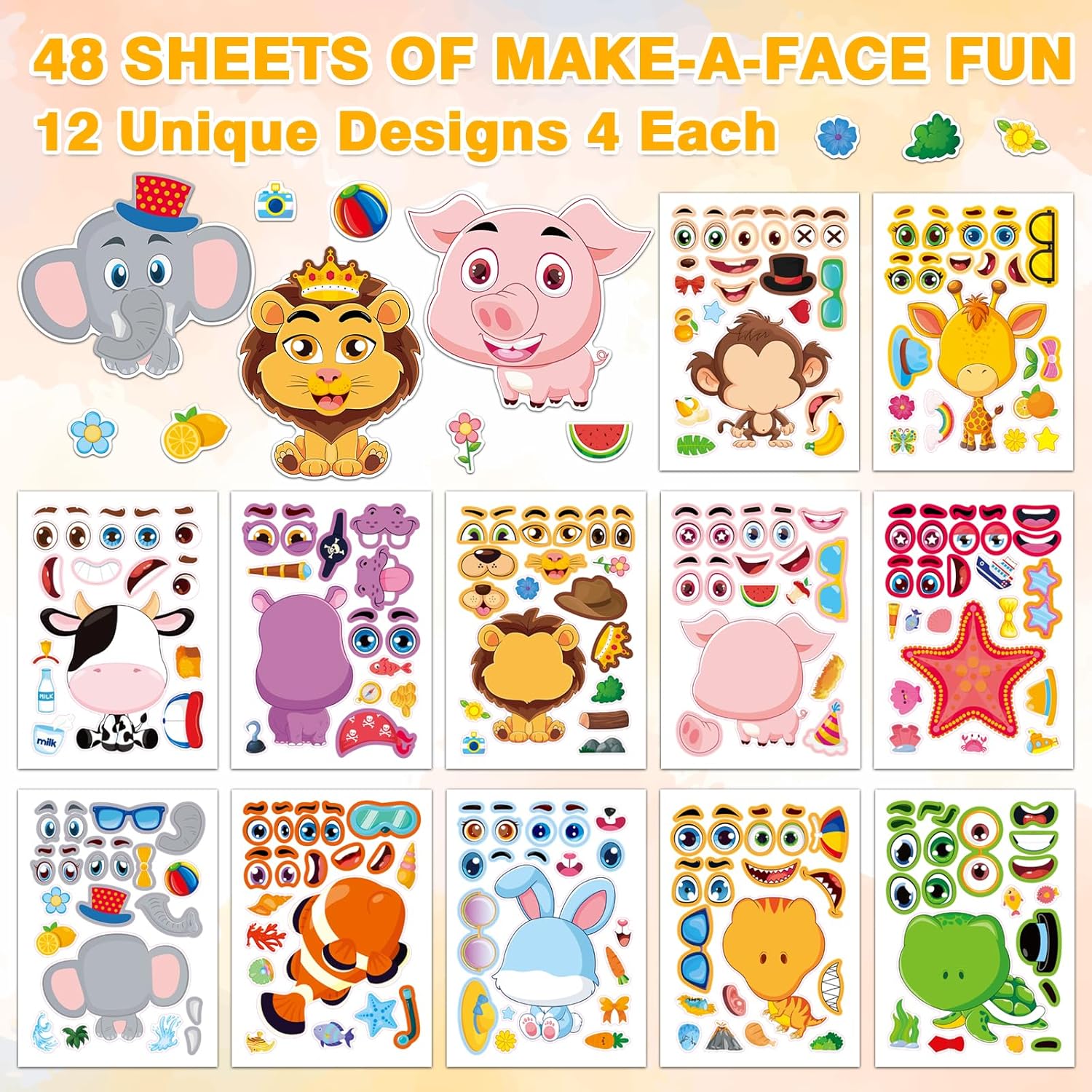- FUN MAKE A FACE STICKERS – 48 sheets of animal-themed stickers with 12 unique designs (lion, elephant, monkey & more). Each design comes with 4 sheets—perfect for group activities, classroom fun & family playtime!