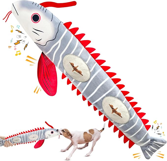 - 【Best Dog Boredom Toys Gifts】Fish-Shape Dog Toys combines squeaking, crinkling, and tugging elements ,whether your dog loves to chase, shake, or cuddle with their toys. This playful fish dog toy is an excellent choice for keeping your pet physically active and mentally stimulated throughout the day