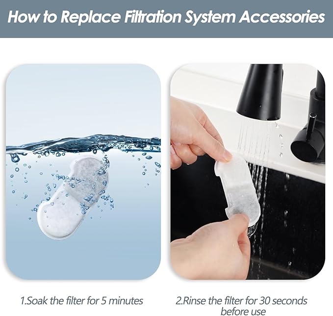 - USE ADVICE - Soak the filter for 5 minutes and rinse for 30 seconds before use. For your pet's health, we recommend replacing the filter every two weeks, if you have multiple pets, cleaning and replacing the filter may be more frequent
