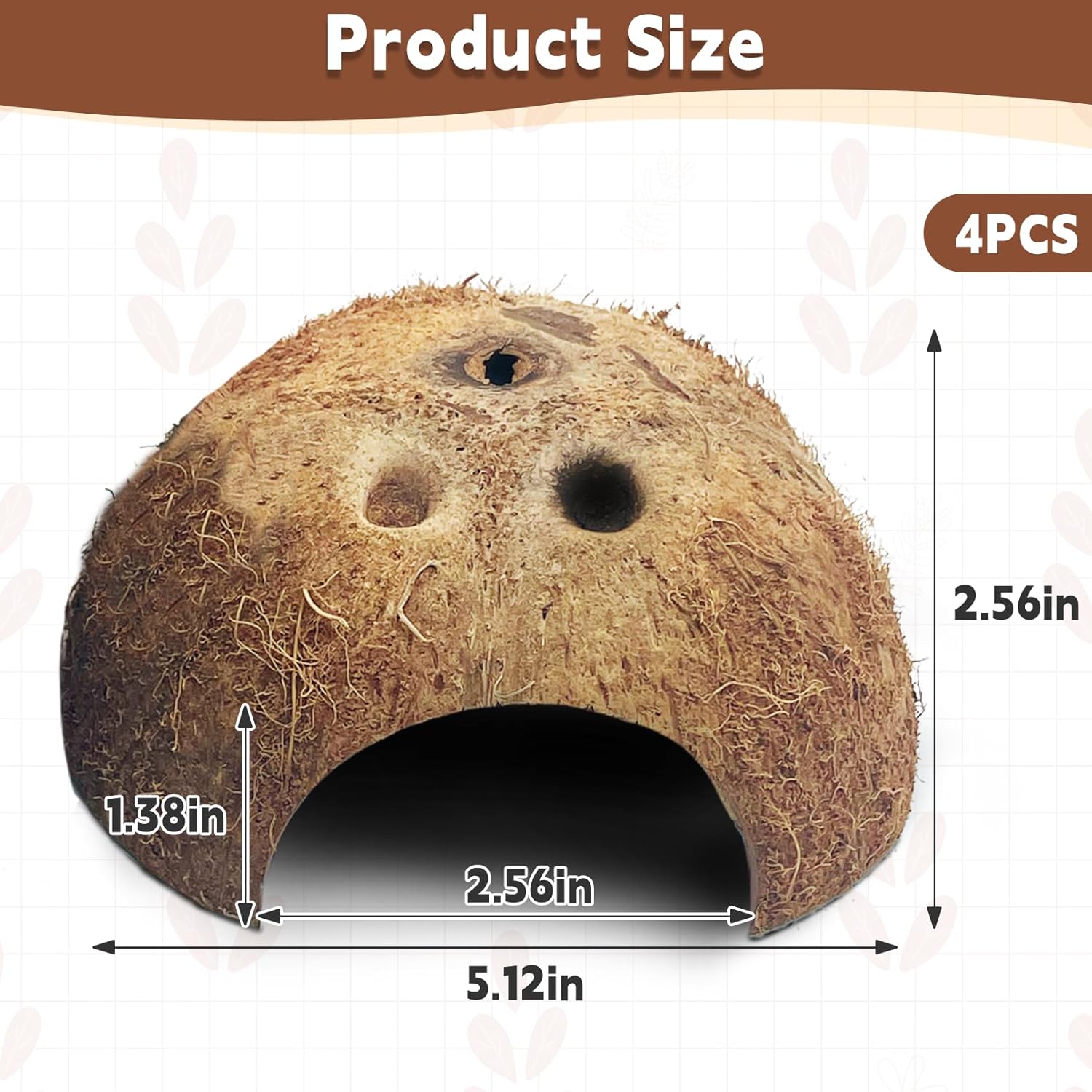 PINVNBY Natural Coconut Reptile Hideouts Lizard, Coco Hut Hermit Crab Hut Aquarium Fish Hide Cave for Small Reptile Crested Gecko Leopard Gecko Spider Snail Climber Toys (4 PCS Natural Surface)