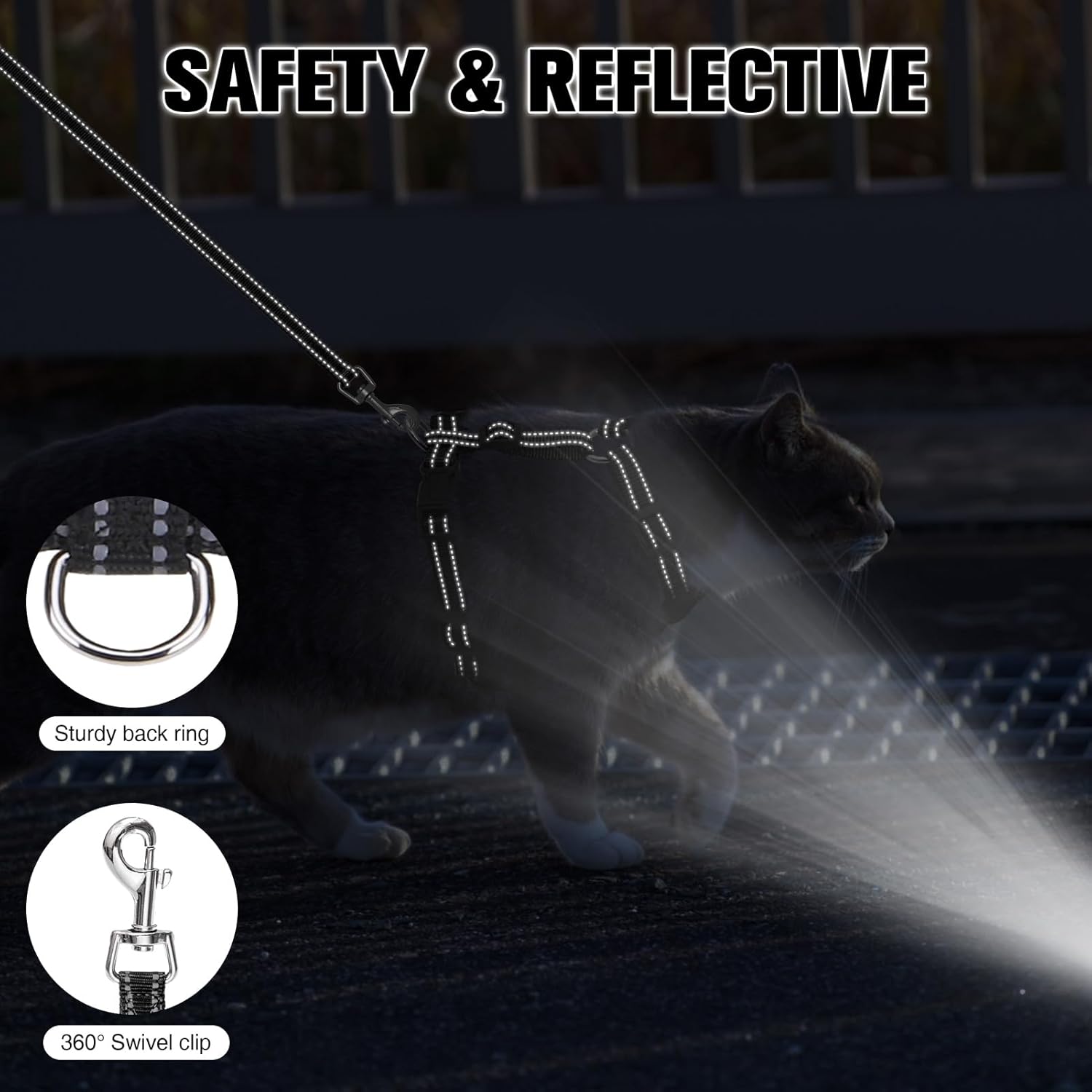 - [REFLECTIVE CAT HARNESS] The reflective trims of the pet vest harness and leash ensure good visibility at night, safe and fashion while out for a walk; This cat harness and leash for walking escape proof is ideal for daily walking, jogging, training, and any outdoor recreations. Also a great cat harness when you're taking your kitty to an unfamiliar place, such as the vet or groomer.