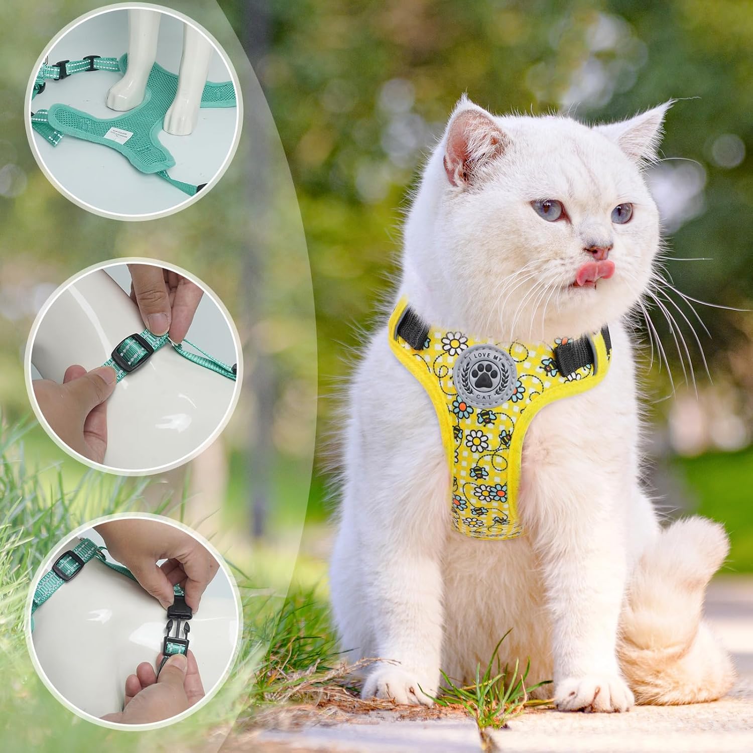 - [HASSLE-FREE OVERHEAD HARNESS] Different from the traditional small cat harness, our new cat vest harnesses have 2 buckles(two are on the chest), NO NEED go through cat's head. Easy to put on and off hassle free and help your sensitive friend loves to wear harness!