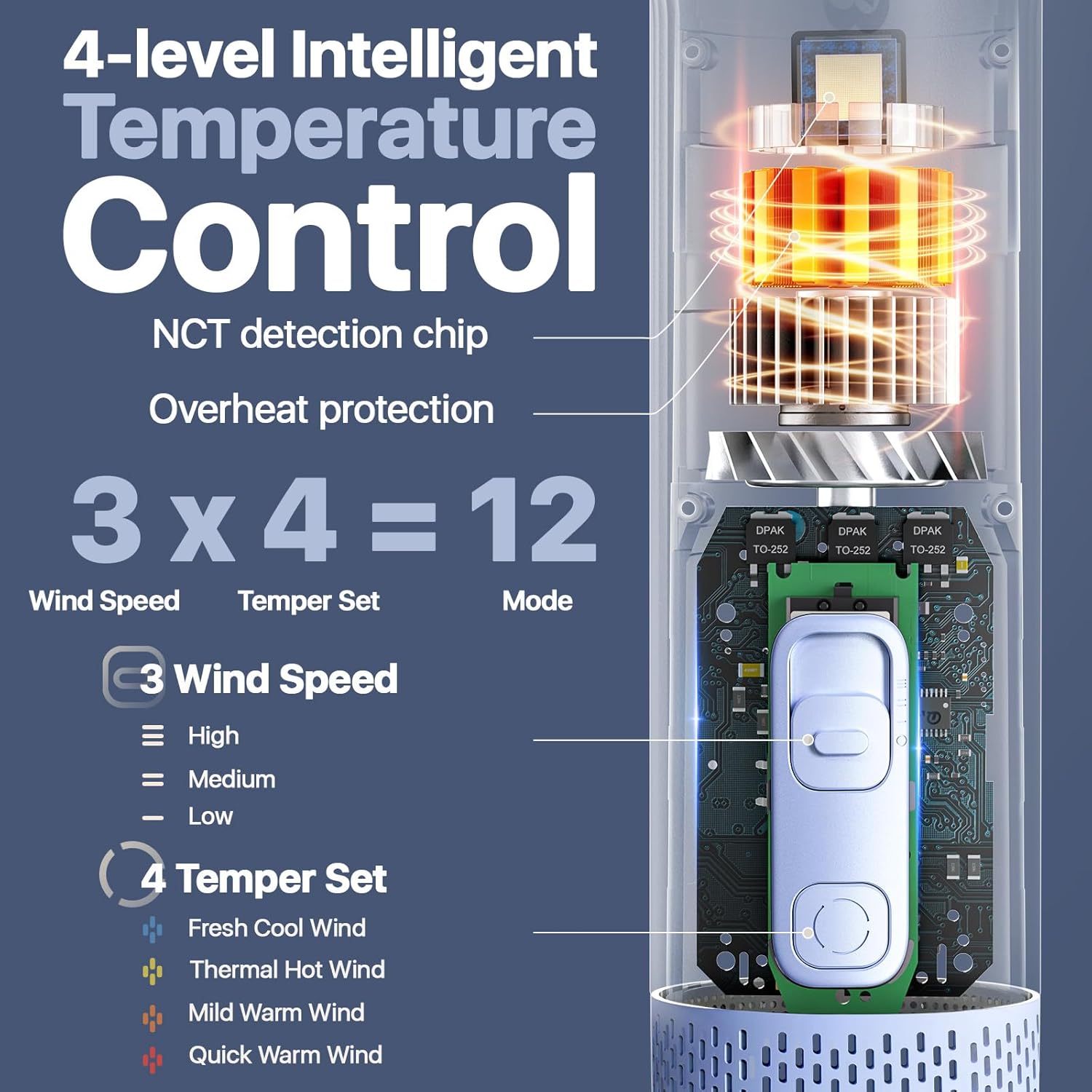 - Intelligent Temperature Control: This dog blow dryer offers 4 - level temperature adjustment. With 3 speeds and 4 tempes, it combines into 12 modes, suiting various pets' drying needs in different seasons and fur conditions. Equipped with overheat protection and an NCT detection chip, it monitors temperature in real - time to ensure wind stays at a suitable temperature, making your pet feel warm and comfortable during drying, giving you peace of mind while using it.