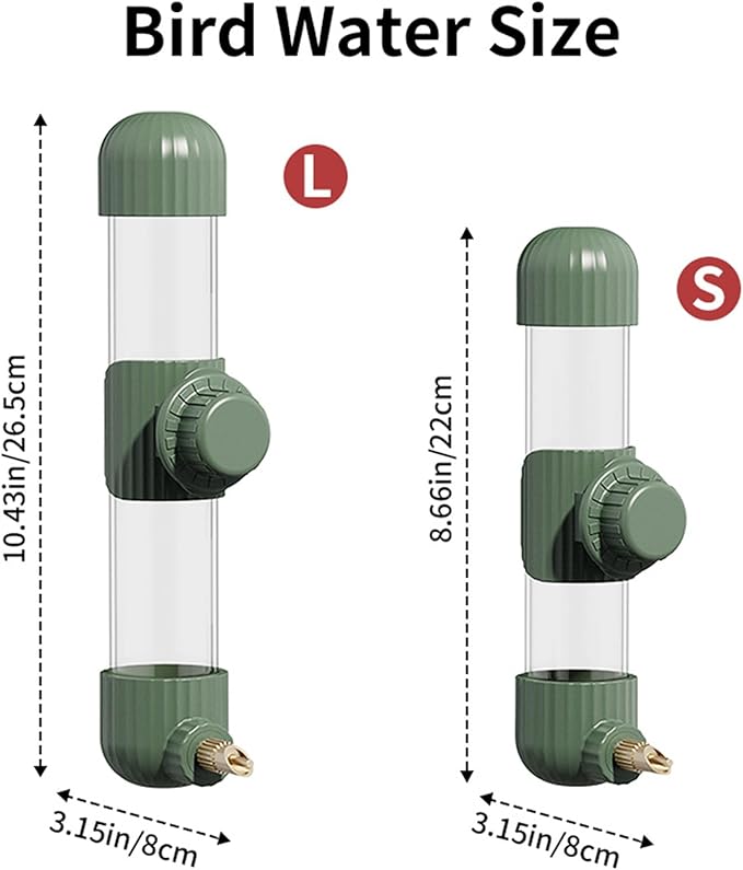 - 【Perfect Size for Small and Medium Birds】Designed with your feathered friends in mind, this water dispenser is available in two sizes: a 10.4-inch version holding 9.4 ounces (280 ml) and an 8.6-inch version holding 7.4 ounces (220 ml). Perfect for small and medium birds like parakeets, cockatiels, budgies, macaws, finches, and lovebirds, it ensures they stay hydrated throughout the day.