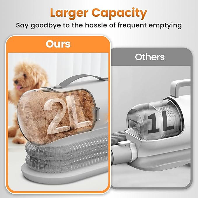 - LARGE CAPACITY DUST CUP-Our dog grooming vacuum for shedding comes with a large dust cup, which is large enough for even large dogs, there is no need to stop and empty it frequently while grooming and trimming, and the dust cup is so easy to empty- just pull the quick-release snap on the dust cup for touch-free emptying.