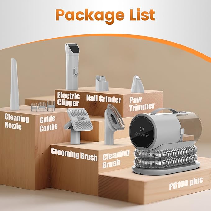 - 7-IN-1 PET GROOMING KIT AND VACUUM-Model PG100 PLUS Dog Vacuum Grooming Kit includes a vacuum, electric clipper, grooming brush, crevice cleaning tool, cleaning brush, and adds a pet paw trimmer and nail grinder compared to the PG100 model. Achieve one-stop pet care for your pet in the comfort of your home, providing a professional-quality grooming experience! Save you time and money on trips to the pet grooming salon.