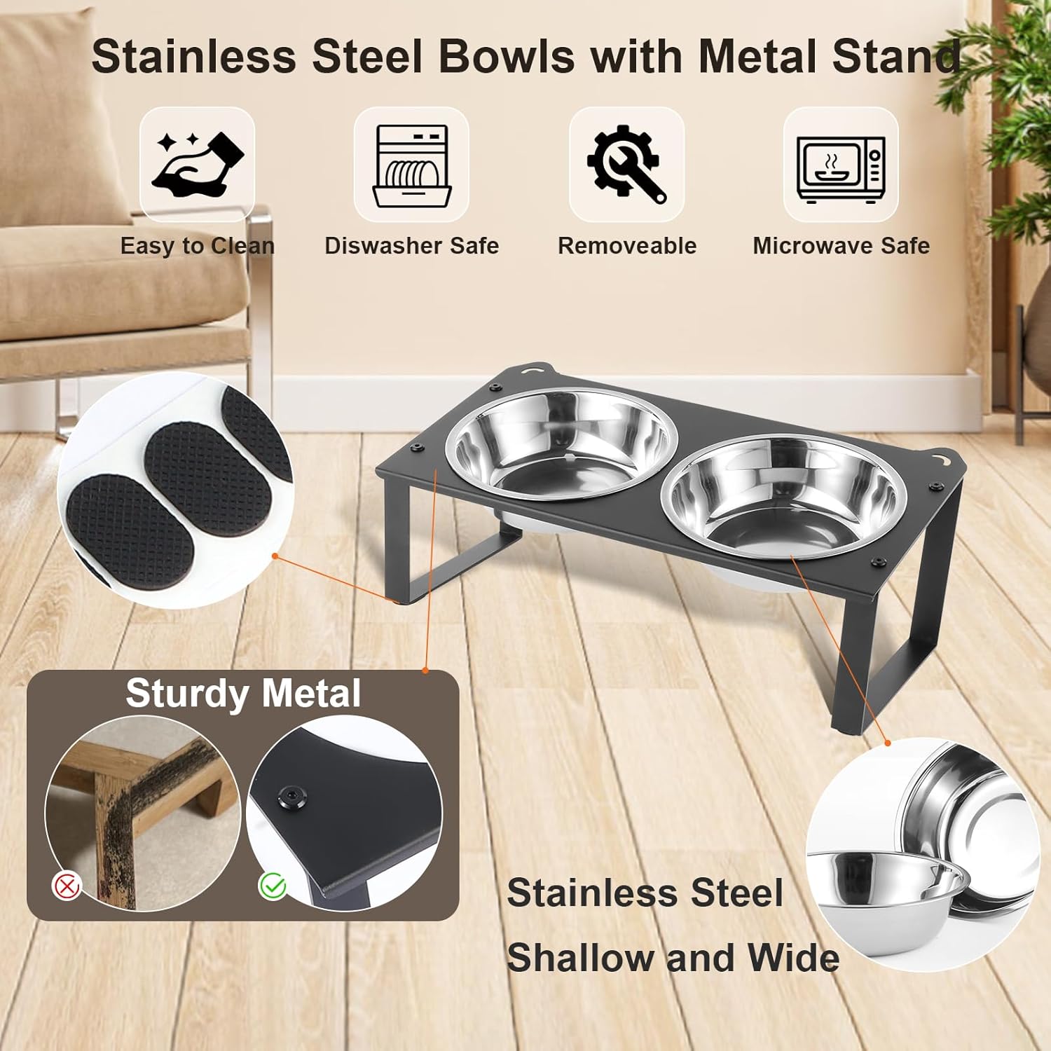 - 2 PACK: Cat food and water bowl set includes 2 bowl holders along with 4 stainless steel bowls, all constructed from robust metal materials. The robust frame ensures stability while being easy to clean. Cat bowl is also dishwasher safe, Our raised cat bowls come complete with all necessary components and clear instructions, easy to assemble and remove. Tilted cat bowl set easily allows multiple cats to use it