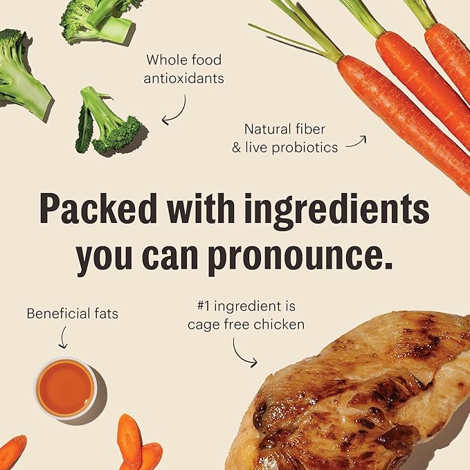 - HUMAN GRADE: As the first human grade dry dog food, our recipe features cage free chicken, wholesome oats, and beneficial probiotics, providing a complete and balanced meal that supports your dog's overall wellness