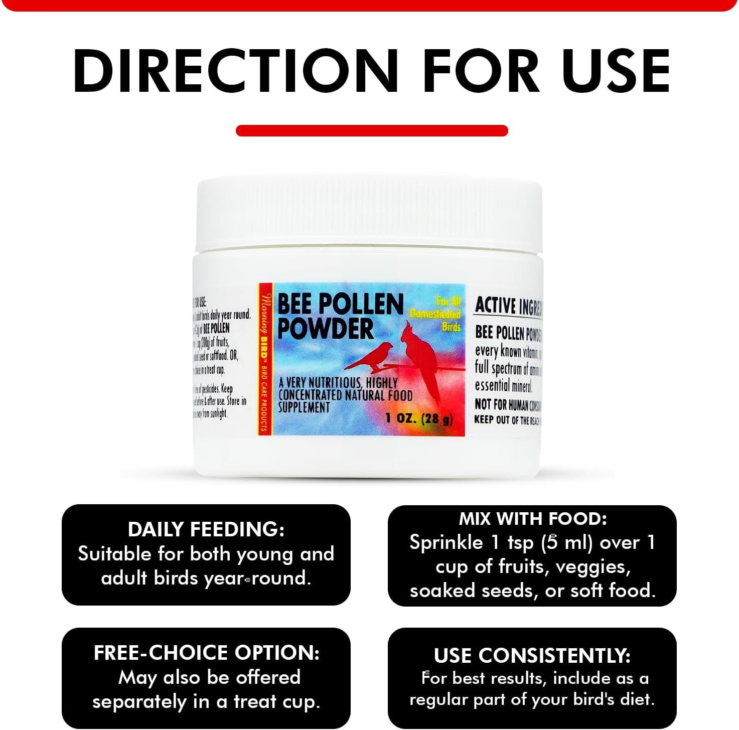 - Nutrient-Rich Energy Booster: Support your bird’s overall vitality with this powerful bee pollen supplement. Rich in natural nutrients, it promotes higher energy levels, stamina, and performance for birds of all sizes and species.