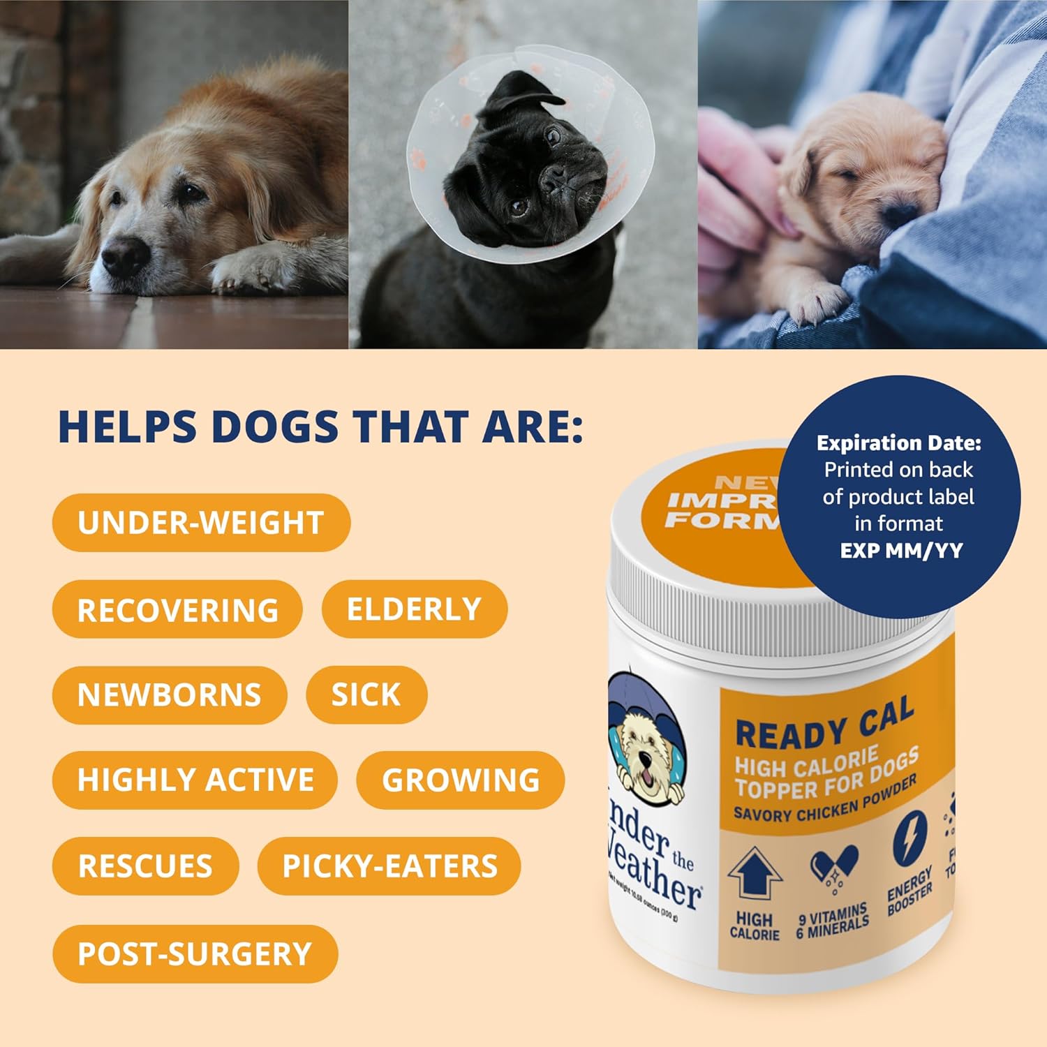 - THE BEST FOR YOUR DOG - Ready Cal Powder for Dogs is vet-formulated to provide the essential calories your dog needs daily to gain or maintain a healthy weight. With a savory rotisserie chicken flavor dogs love to promote weight gain. Proudly manufactured in the USA without artificial flavors or dyes.