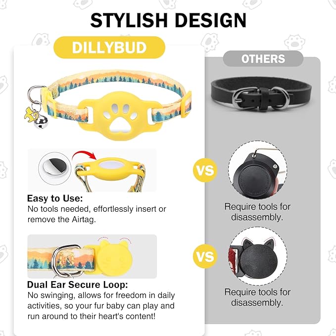 - DESIGNED FOR AIRTAG - The DILLYBUD Integrated Airtag Cat Collar is designed to keep your airtag securely in place, preventing it from wobbling, dangling or falling off. This feature makes it easier to locate your pet. In addition, the sturdy buckle and comfortable material minimize the risk of choking or accidents. (Airtag not included).