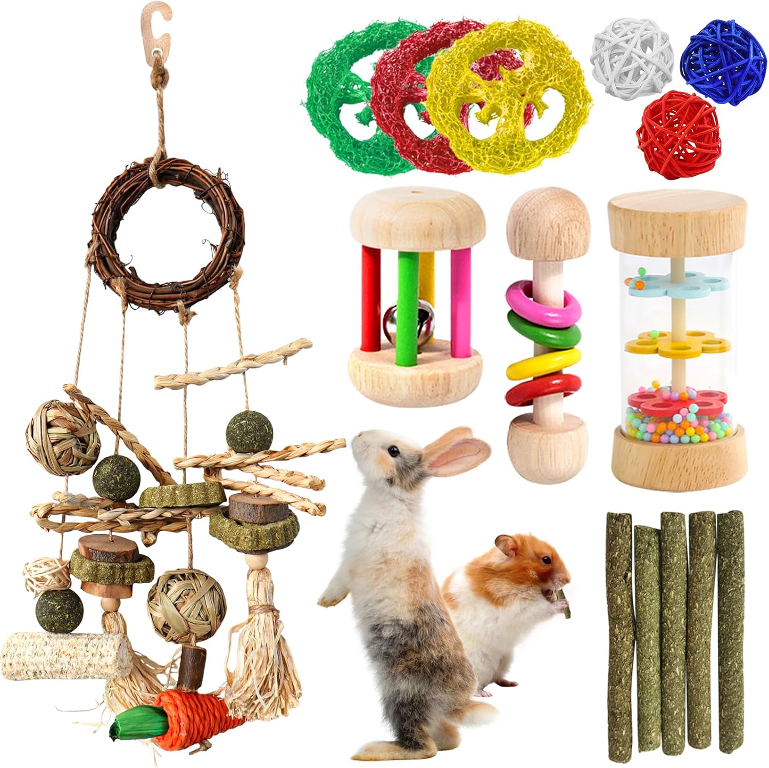 - 【MULTIFUNCAIONAL CHEW TOY】- This bunny enrichment toys can meet daily needs for bunny chewing, foraging, exploring, helping to grind down the growing rabbit teeth and prevent overgrowth.The hay balls, rattan balls and wheat ears in guinea pig chew toys set help rodents to better teeth grinding, nutrient-rich corn husks, grass cakes and loofah slices to help improve digestion and increase appetite. Encouraging them keep health by chewing and playing with rabbit chew toys for teeth.