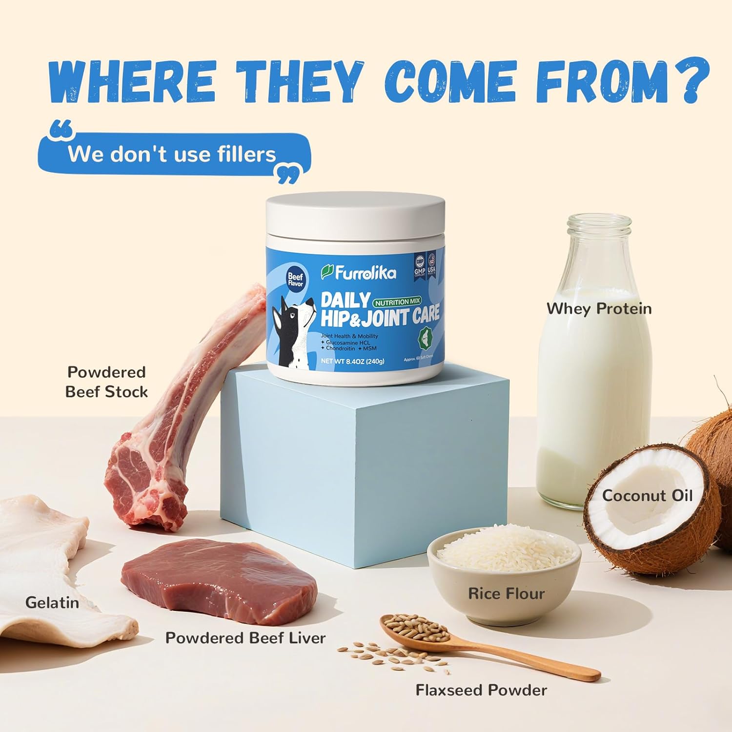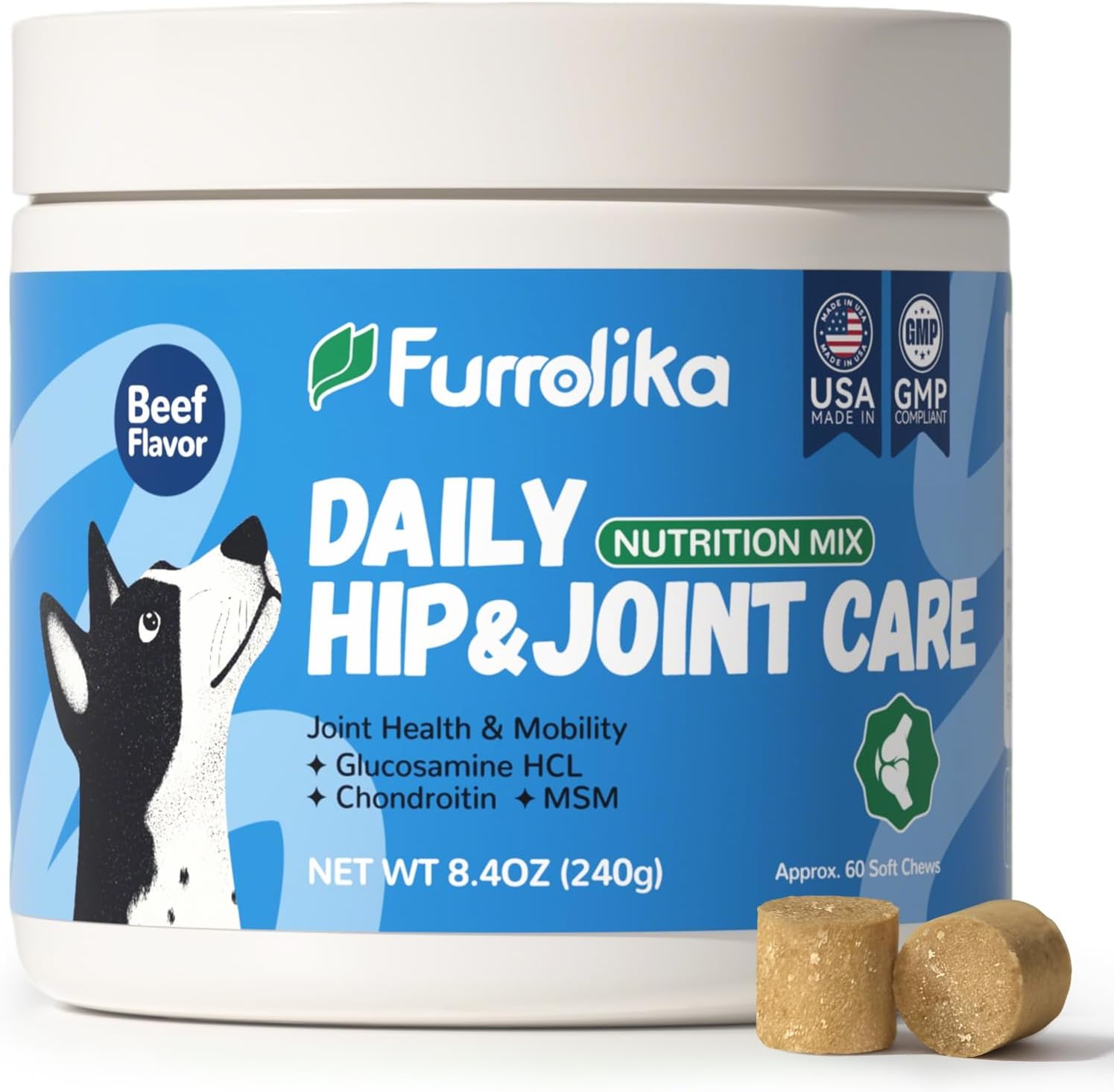 Furrolika Hip and Joint Supplement for Dogs – Made in The USA – Glucosamine, Chondroitin, MSM, Vitamin C – Chewable Joint Support for Mobility & Comfort – Beef Flavor – 60 Soft Chews