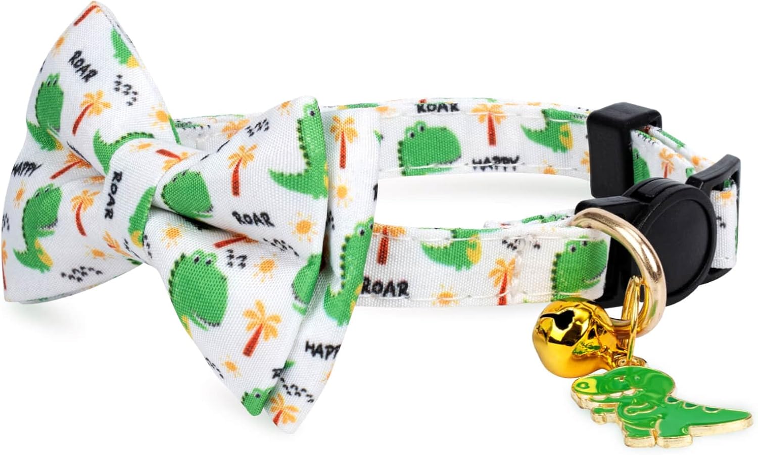 2 Pack Cotton Cat Collar with Bow Tie and Bell for Girl Boy Cats,Cute Pink Flamingo and Blue Whale Pattern Spring Summer Breakaway Cat Collar for Male Female Cats (Dinosaur)