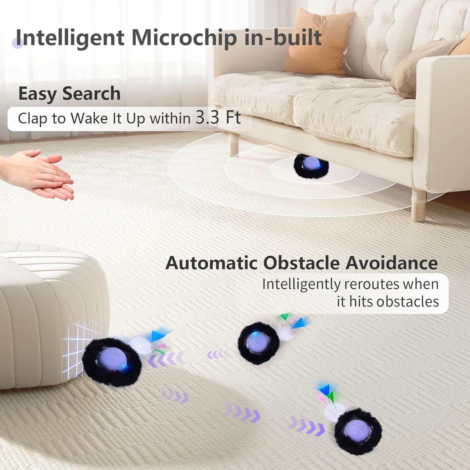 - 【Simply Clap to Find Lost Ball】: Worried about losing the cat toy ball? ORSDA’s smart ball is equipped with a highly sensitive sound-activated chip. Simply clap within about 3.3Ft range, and it will start moving again. Plus, it has an automatic obstacle avoidance function to prevent it from getting stuck under the sofa or bed.