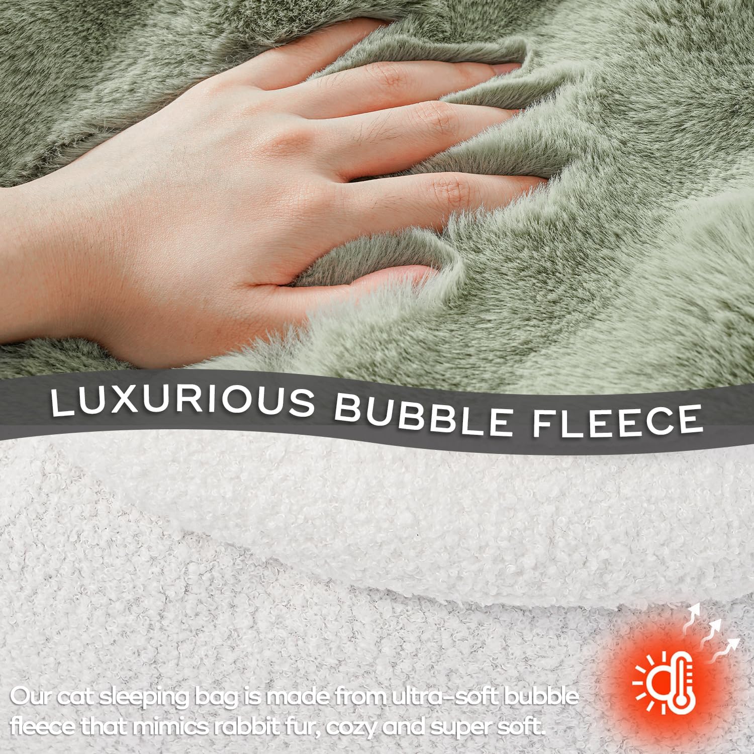 - LUXURIOUS PLUSH MATERIAL. Cat bed is made from ultra-soft plush fabric, this sleeping bag ensures your cat or puppy stays comfortable and snug all season long.