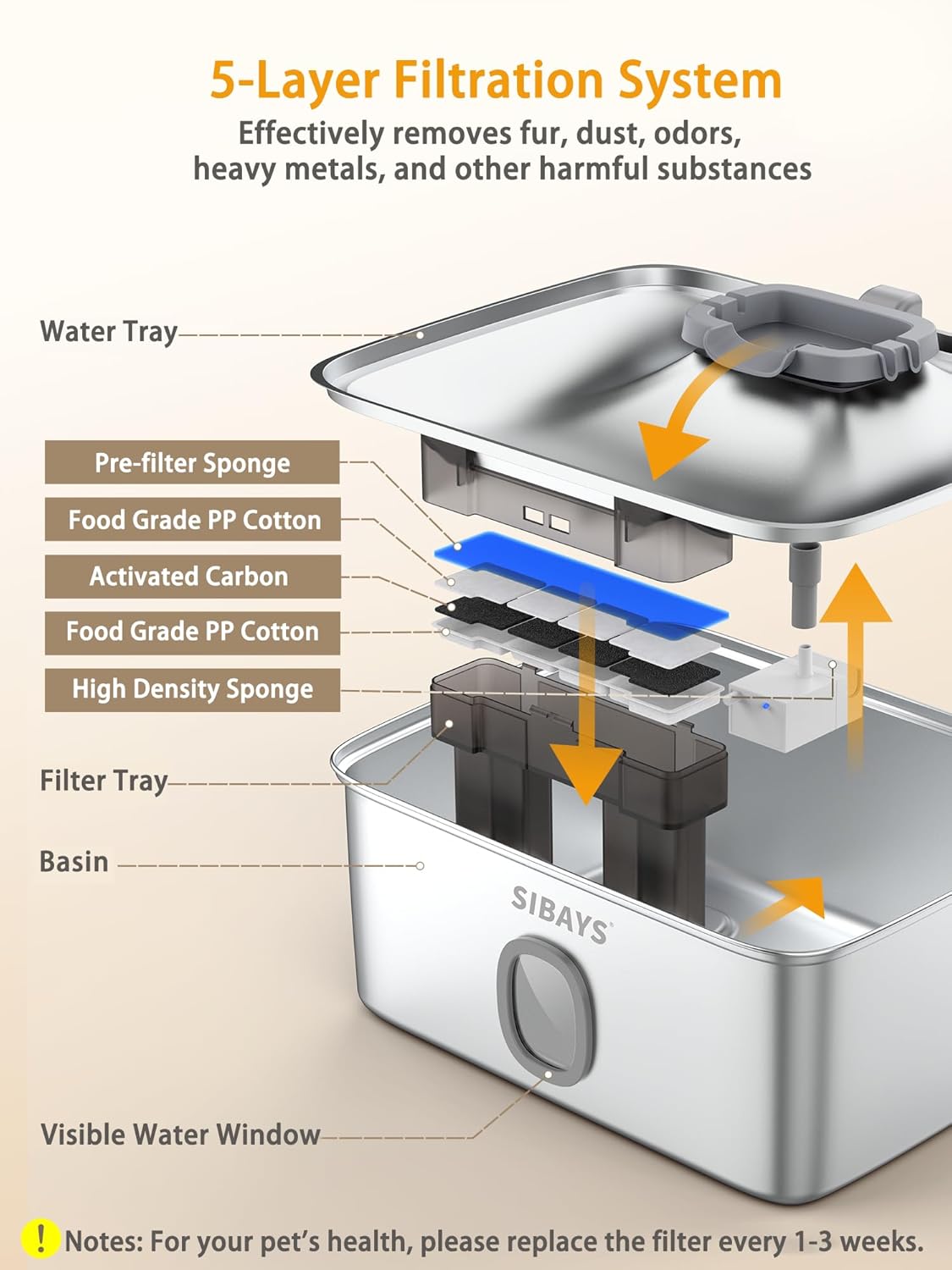 - Easy to Clean: Stainless steel dog water fountain can be assembled and disassembled in just a few minutes, making it easy to clean and replace. For your pet's health, we recommend replacing the filter and sponge every 1-3 weeks. You can search "L05" in SIBAYS store, or search "B0DXPPGVTZ" on Amazon to buy the replacement filters. And search "P05" in SIBAYS store or search "B0F6D1YS8C" on Amazon to buy the replacement pump.