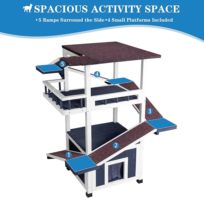 - Multi-Cat Playground: Engineered with 5 connecting ramps and 4 lookout perches, 2 large balconnies, this outdoor cat house turns your backyard into an adventure zone where 3+ cats can climb, nap, and play tag without crowding