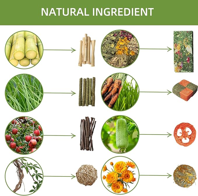 - ✅50-60PCS DELUXE PACKAGE INCLUDES: Apple wood + Timothy Hay Sticks + Sweet Bamboo Mix 200g + Crunchy Treats*3 + Carrot & Timothy Hay Brick Combo*2 + Marigold Hay Ball*1 + Rose Hay Ball*1 + Heart-Shaped Hay Cake*1 + 3cm Small Vine Balls*2 + Luffa Slices*3