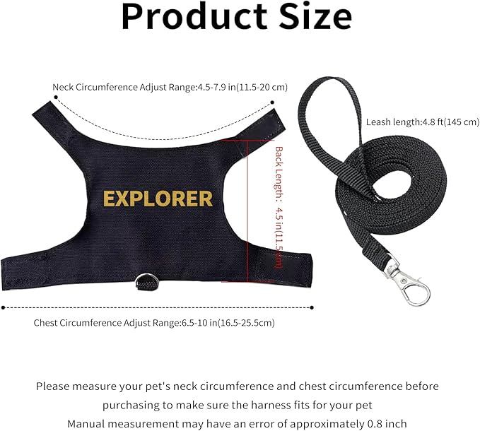 - 【Size of Bearded Dragon Harness and Leash】 This harness is suitable for small animals with neck circumference: 4.5"- 7.5",chest circumference: 6.5" to 10".This harness set also comes with a 5.2ft leash for escape proof in outdoor walking