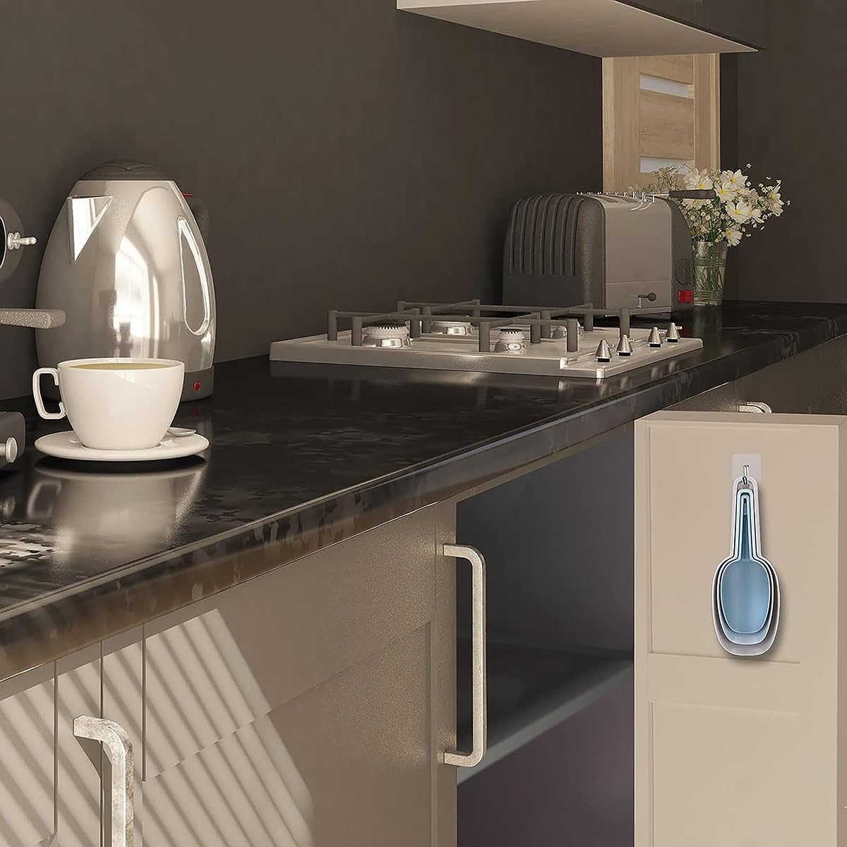 - Size:Large:This is a set of scoops for canisters of different sizes; The smaller scoopers can be inserted into larger ones - snap together easily; Nested as a whole set, They take up virtually no space in your cabinet; Furthermore, with a hanging loop at the handle rear, they can be nested first and then hung on a wall hook;
