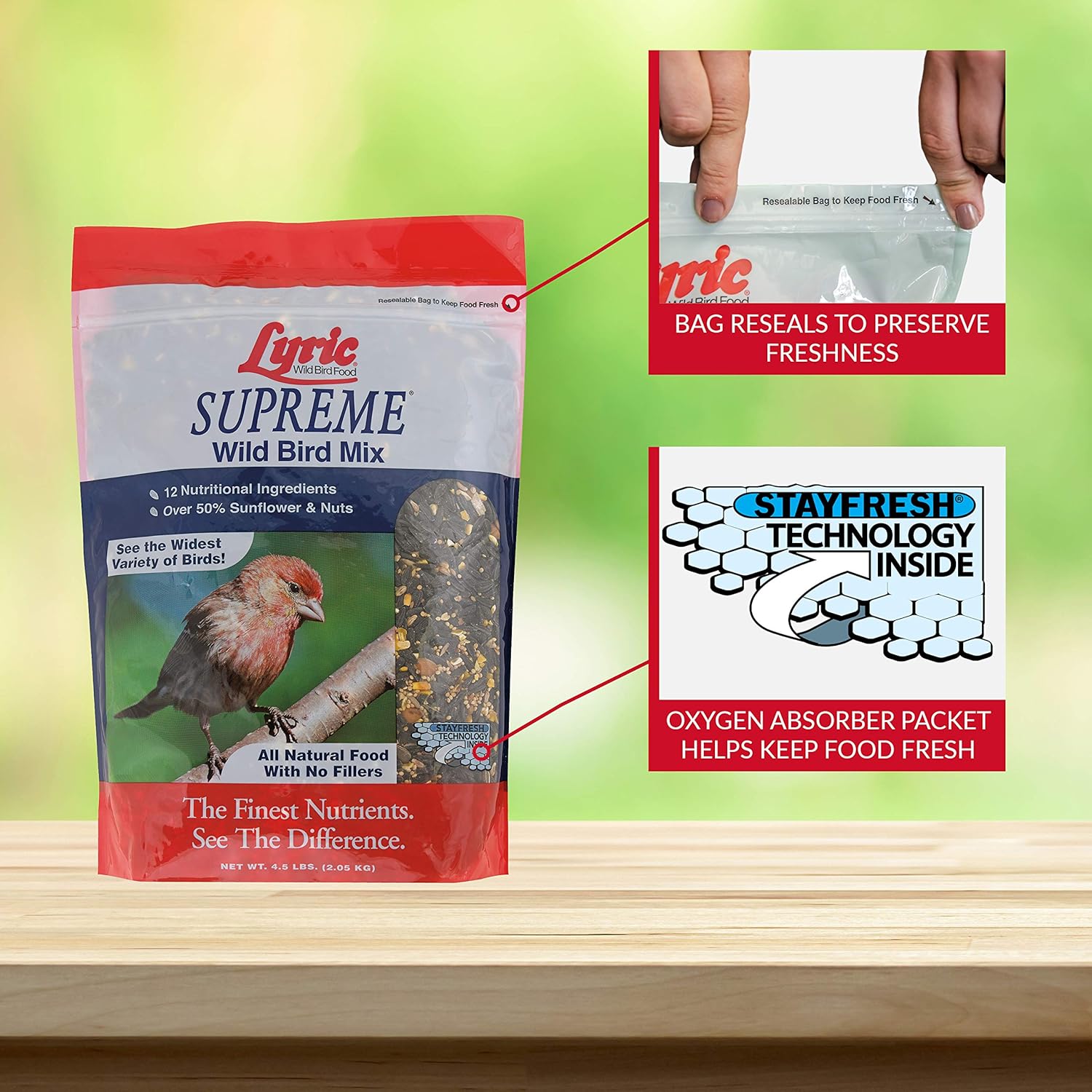 Lyric Supreme Wild Bird Seed for Outside Feeders - Wild Bird Food Mix with Nuts & Sunflower Seeds, Attracts Many Beautiful Songbirds, 13.5 lb (Pack of 3-4.5 lb Bags)
