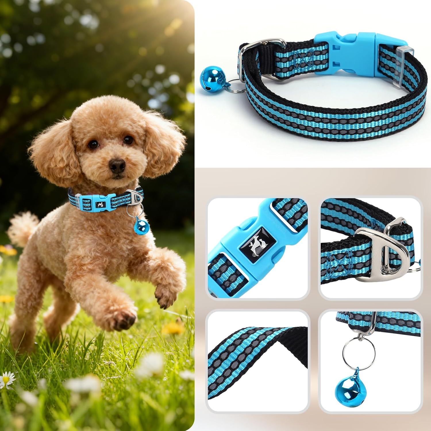 Reflective Dog Collar with Bell - Hypoallergenic Adjustable Nylon Puppy Collar for Night Safety, Soft Comfort Fit Small Dogs & Cats, Blue Small