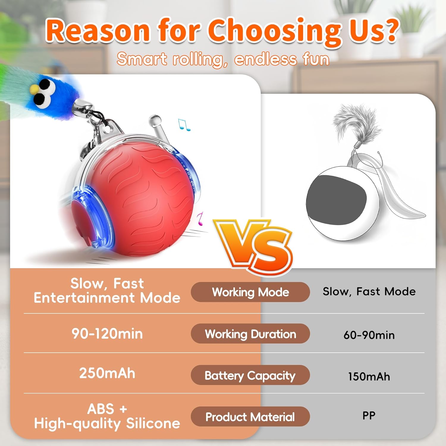 - 3-Speed Modes: Switch between Slow, Fast, and Entertainment Mode with a single button press. Each mode triggers 360° random rolls to mimic prey movements. Built-in sensors wake the toy when touched, keeping cats engaged for hours on carpets or floors
