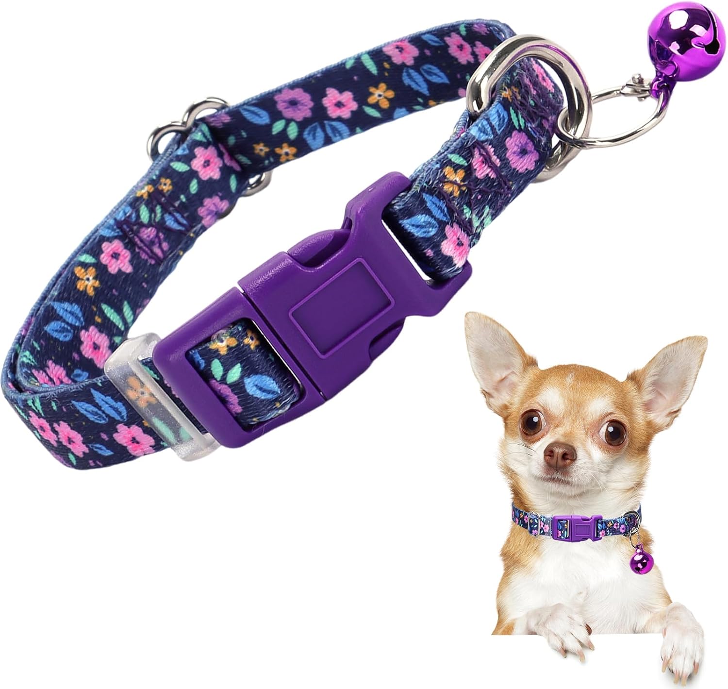 Nylon Dog Collar with Bell for Small Dogs, Adjustable Puppies, Kittens & Small Pets Collar- Purple Floral Design, XXS-XS-S Sizes, Lightweight & Secure Fit, for Pet Owners (S)