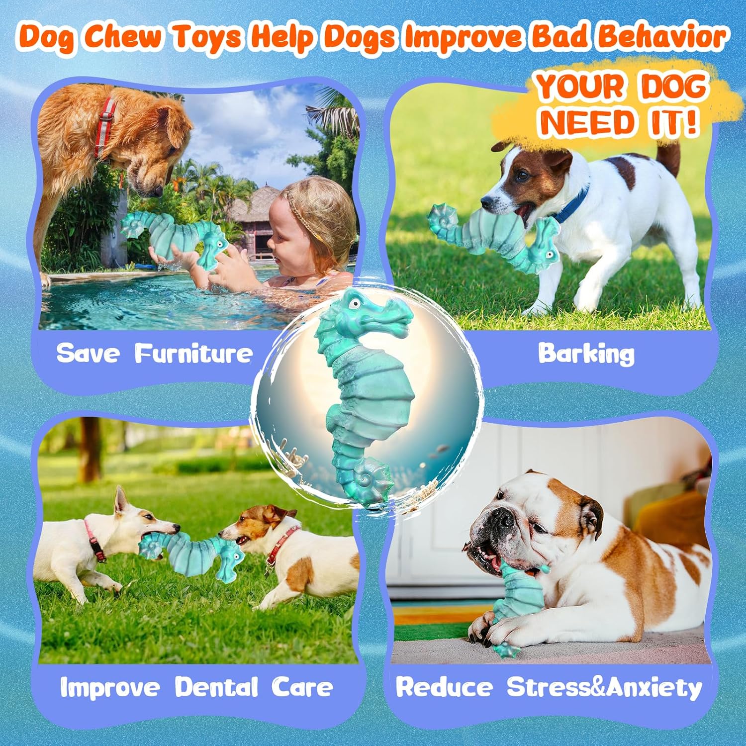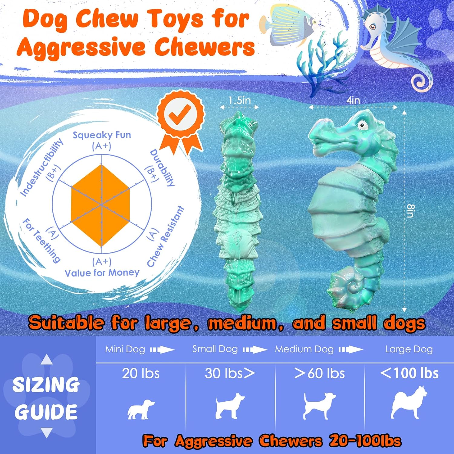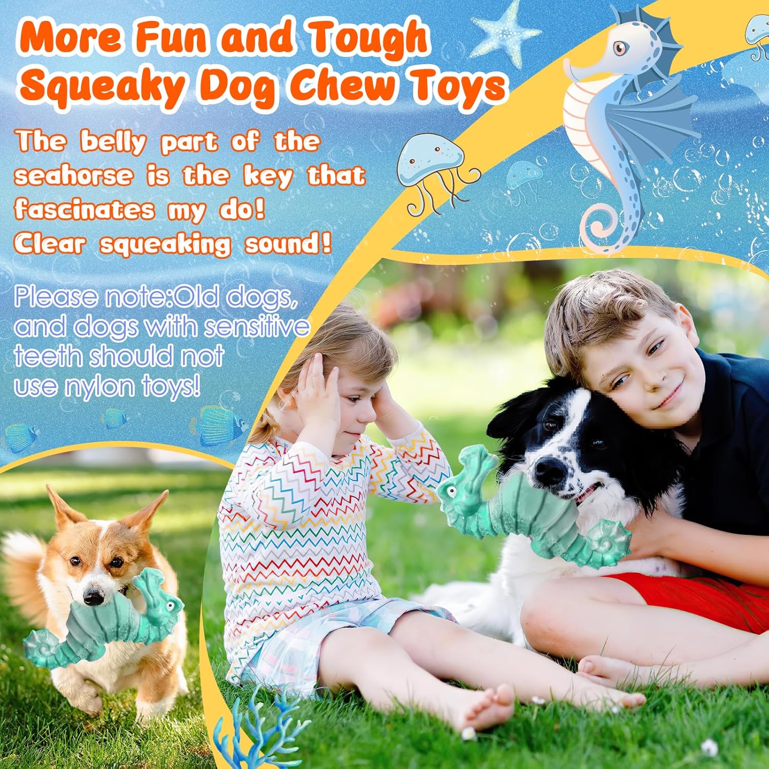 - 【Squeaky Dog Chew Toys】: The dog chew toys feature a cartoon seahorse design and a built-in fun squeaker. When your dogs presses or chews the dog toy, the tough dog toys will make fun sounds to attract the dog's attention and interest, bringing more fun