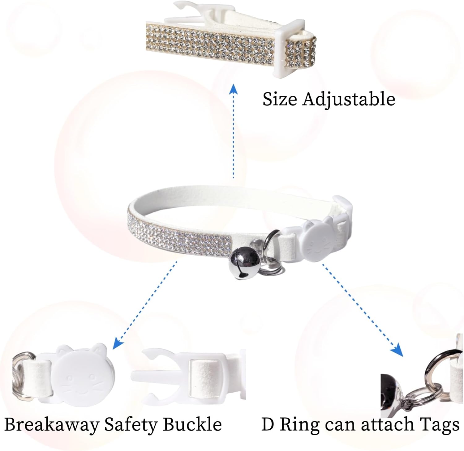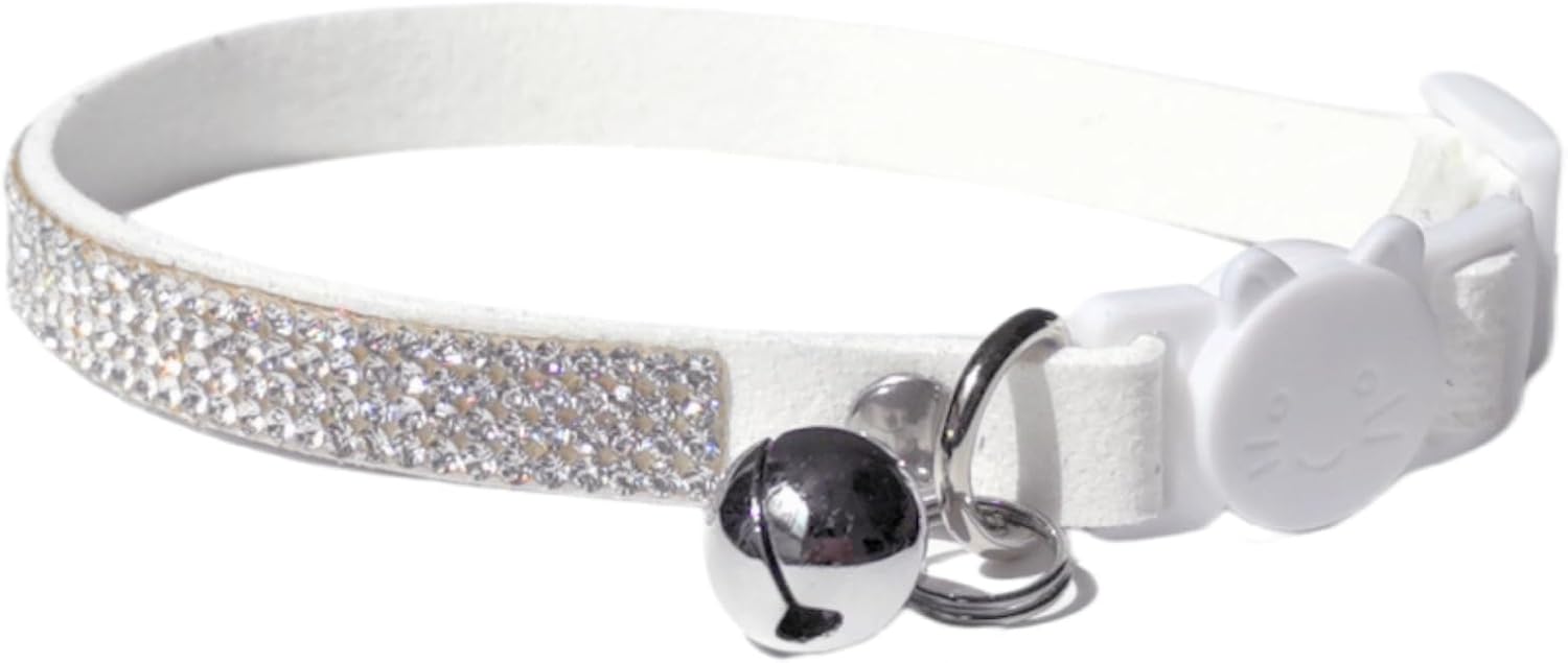 Rhinestone Cat Collar Breakaway with Bell Safety Buckle, Adjustable Diamond Girl Boy Kitty Cute Comfy Collar for Kitten Tiny Little Pets Rabbits, 6"-9" White Extra Small