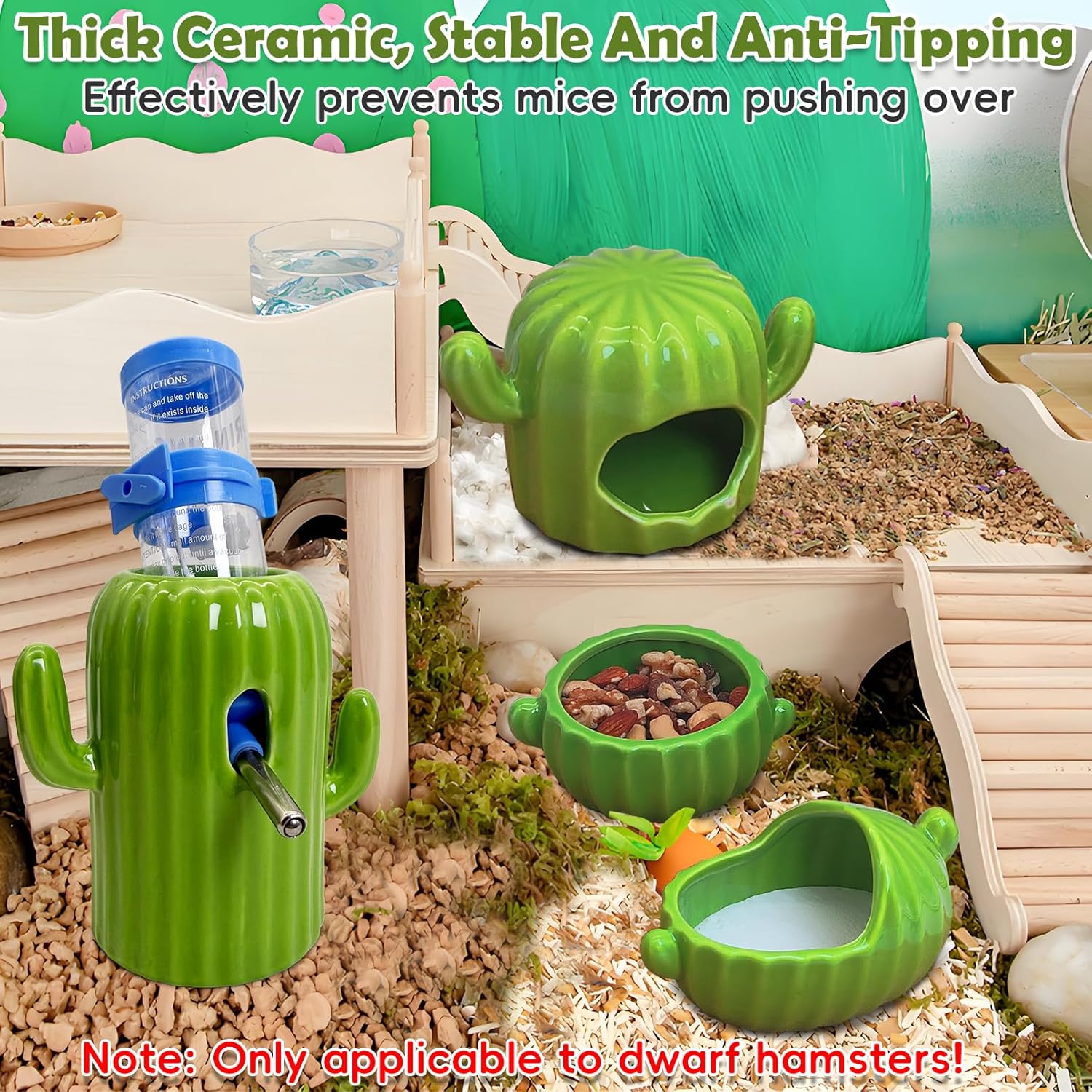 PINVNBY Ceramic Hamsters Hideout, Cactus Ceramic Dwarf Hideout, Hamster Water Bottle, Sand Bath, Food Bowl & 125ML Water Bottle Holder for Dwarf Hamster Cage Accessories