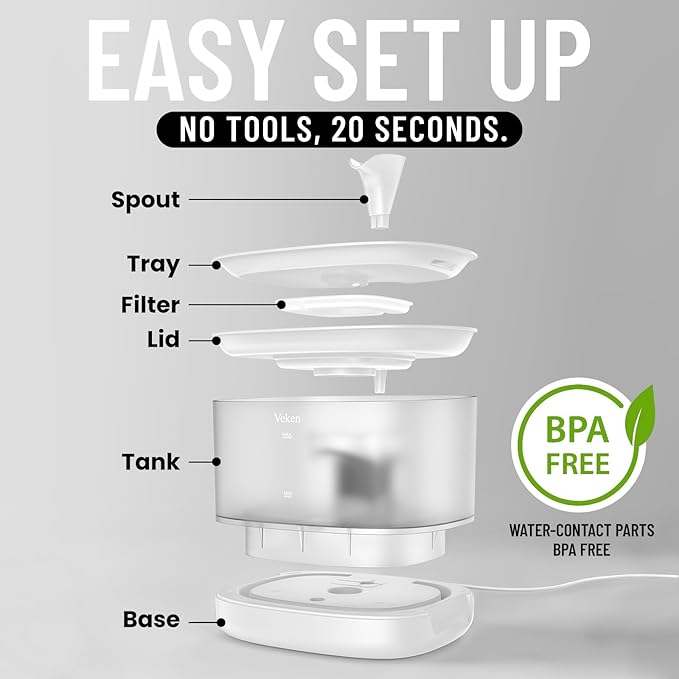 Veken Cat Water Fountain with Detachable Tank, Easy to Clean & Assemble, 84oz/2.5L Automatic Pet Drinking Dispenser with Quiet Operation & LED Light for Cats, Dogs and Small Pets, White