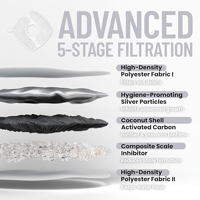 - Advanced 5-Stage Filtration: Our fountain features a 5-stage filtration system with upgraded materials, including silver, composite scale inhibitors, and activated carbon. This combination ensures your pet has fresh and pure water for up to 3 weeks.
