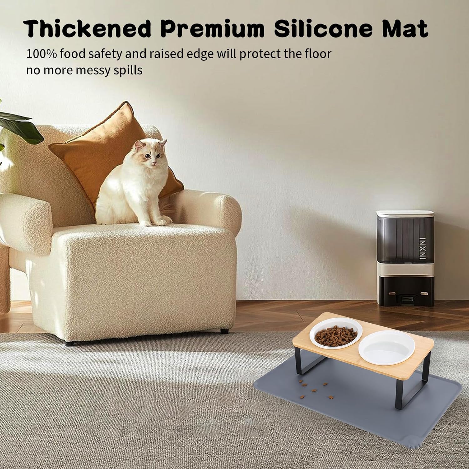 - 【Silicone Food Mat】Pet feeding bowl with silicone bowl mat can prevent cats and puppies from spilling food residue on the floor while feeding, keep the room or carpet clean and hygienic. Thickened silicone material, no need to worry about cat licking, food safety.Great Value Matching, Mat Size:18.9*11.8 inches.